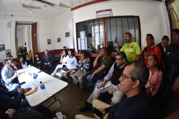 Acompañado por el Secretario del Ayuntamiento, el Tesorero y el Director General de Medio Ambiente y Ordenamiento Territorial, el Presidente Municipal se reunió con las y los comerciantes en las oficinas de la administración del Mercado Hidalgo.